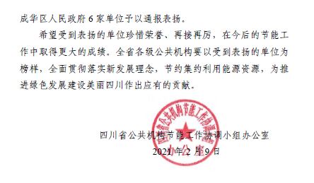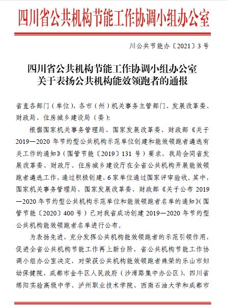 2月9日,四川省公共机构节能工作协调小组办公室公布关于表扬公共机构能效领跑者的通报,我校节能工作获通报表扬。