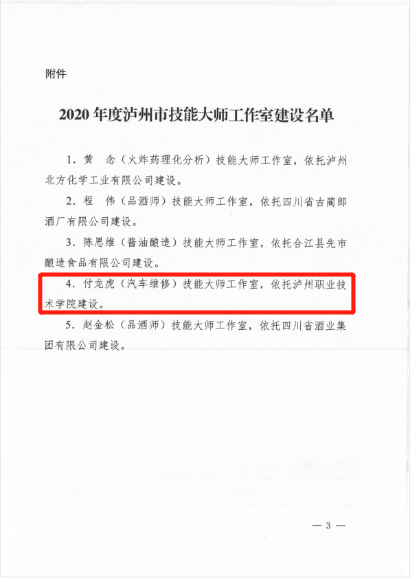 我校推荐申报的2020年付龙虎(汽车维修)技能大师工作室建设项目,经泸州市人力资源和社会保障局组织专家评审、实地考察、综合评议,顺利通过认定,喜获立项建设。