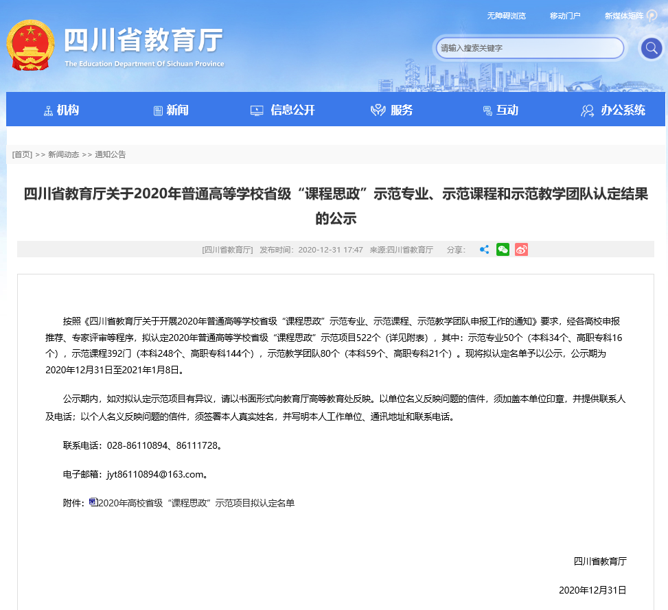 近日,四川省教育厅公布了四川省2020年普通高等学校省级“课程思政”示范专业、示范课程和示范教学团队认定结果。我校推荐的《管理学基础》等4门课程被认定为“课程思政”示范课程、“《大学生心理健康教育》《大学语文》《中华传统文化经典选读》人文素质公共课程群‘课程思政’示范教学团队”被认定为“课程思政”示范教学团队。