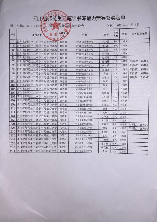 12月3日,2020年四川省师范生“三笔字”书写能力竞赛结果正式公布,我校人文学院学子与全省本专科高校参赛学生同场竞技,创造佳绩,获一等奖7人次,在一等奖中占比超过15%。另获二等奖13人次,三等奖9人次。