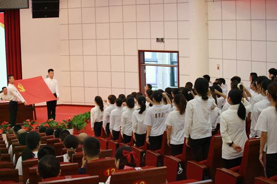 大会首先举行新党员宣誓仪式,75名新党员在监誓人梁杰和领誓人余晓萍的带领下,面向党旗,举起右手,庄严宣誓。