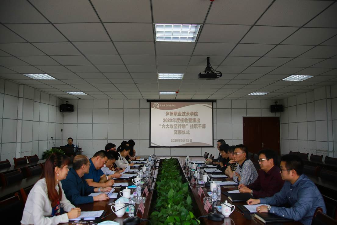 5月25日, 我校2020年度接收暨派出“六大攻坚行动”一线挂职干部交接仪式在415会议室举行。市住房和城乡建设局党组成员、机关党委书记卢山,商务会展局党组成员、副局长刘春涛,江阳区委常委、组织部部长张生勇,龙马潭区委常委、组织部部长袁瑞,江阳区人民检察院党组书记、检察长张聪,龙马潭区胡市镇党委书记吴开会,学校党委书记何杰,党委副书记、院长杨宗伟,党委副书记张爽,纪委书记熊剑,党委常委、组织人事处处长曾国锋出席交接仪式。挂职干部张霞、周昊、郭浩翔、郎润华参加交接仪式。交接仪式由杨宗伟主持。