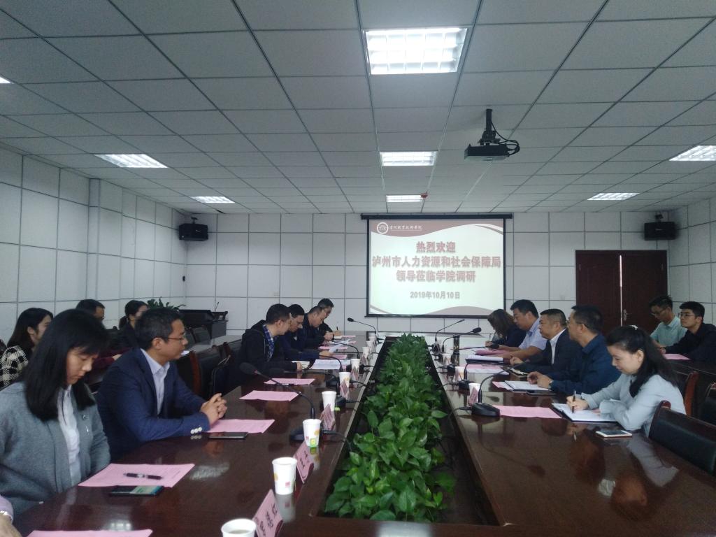 2019年10月10日上午,由泸州市人社局就失科科长姚波带队的,市人社局、市就业局、市人才服务中心、龙马潭区人社局、龙马潭区就业局、四川国祥税务事税务所有限公司的领导和专家组成的调研组,莅临学校调研指导工作,与我校共商大学生就业创业和职业技能站建设大计。学校副院长卢世伦,泸天化学院(继续教育学院)、计划财务处相关人员出席此次座谈会。会议由卢世伦主持。