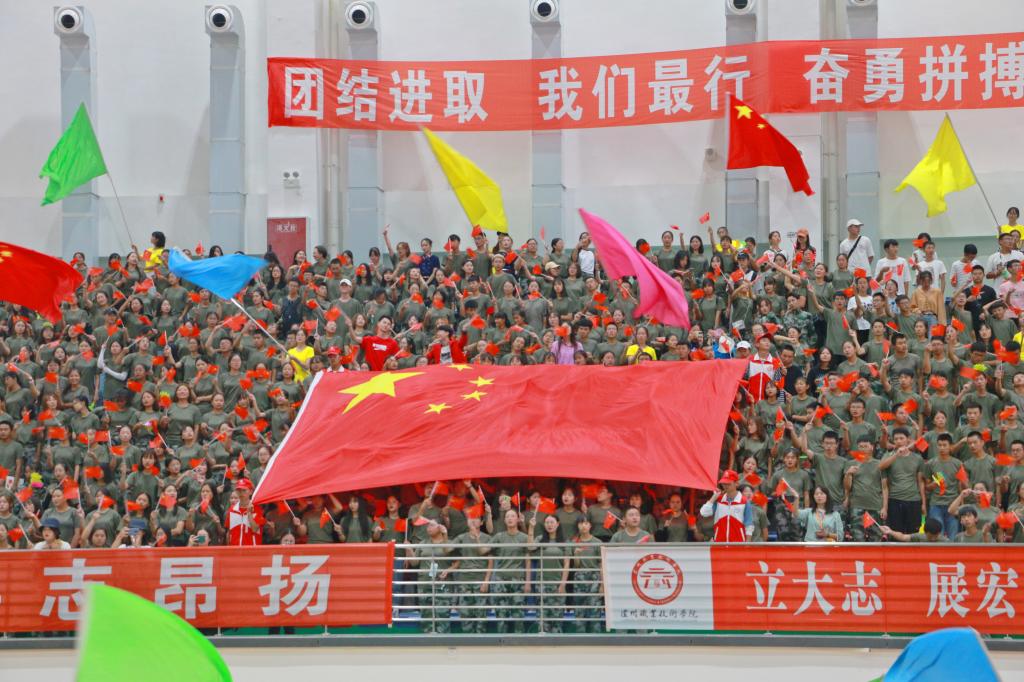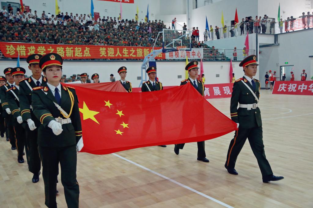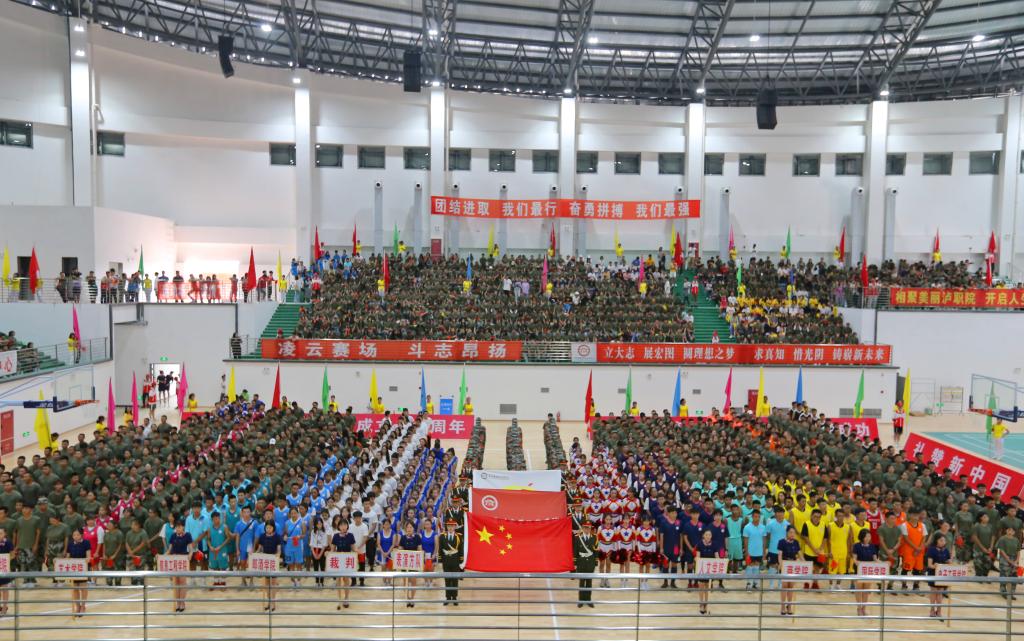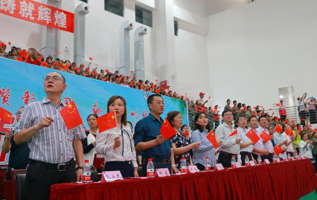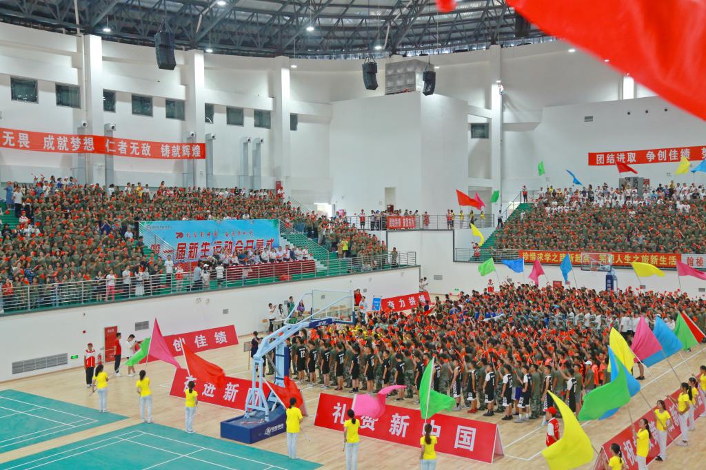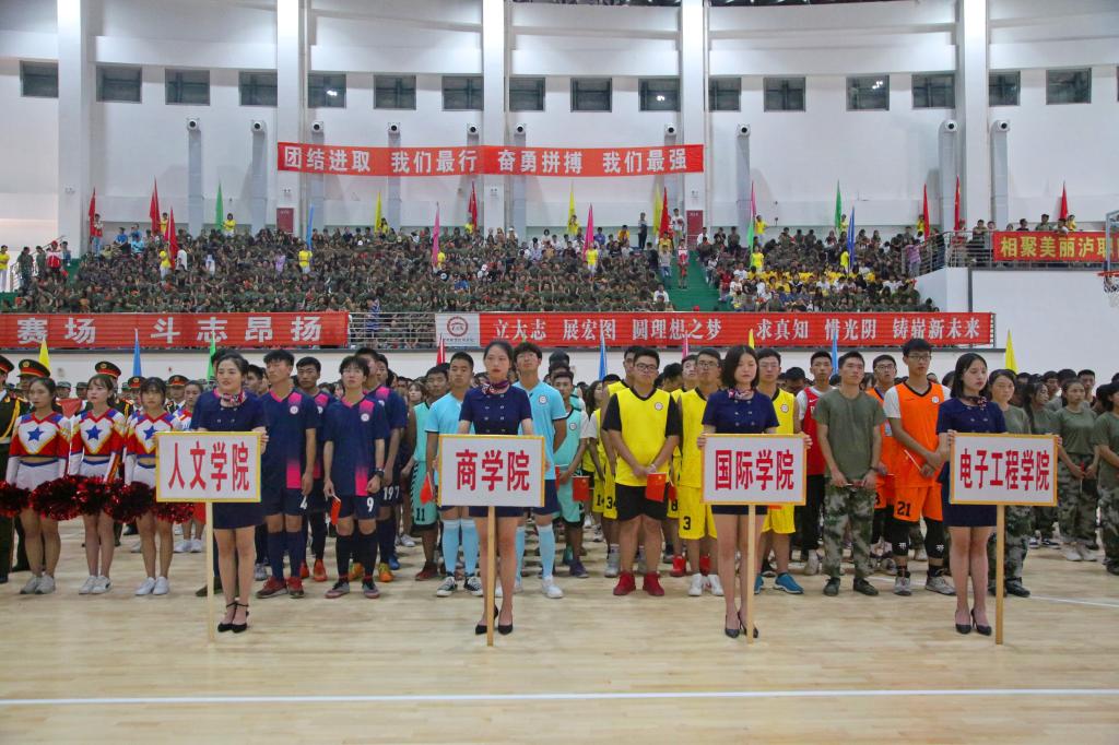为庆祝中华人民共和国成立70周年,贯彻落实国务院办公厅《关于强化学校体育促进学生身心健康全面发展的意见》文件精神,推动我校体育运动高质量发展,培养学生竞争意识、协作精神,我校第一届新生运动会开幕式于9月27日15:00在室内篮球馆隆重举行。学校党委书记何杰,党委副书记、院长贺元成,党委副书记张爽,副院长徐波,党委委员邓安容出席开幕式。各职能部门、二级学院(部)负责人,二级学院党总支副书记、团总支书记,新生辅导员,2000余名新生观众、700余名运动员和近300名学生志愿者参加开幕式。开幕式由张爽主持。
