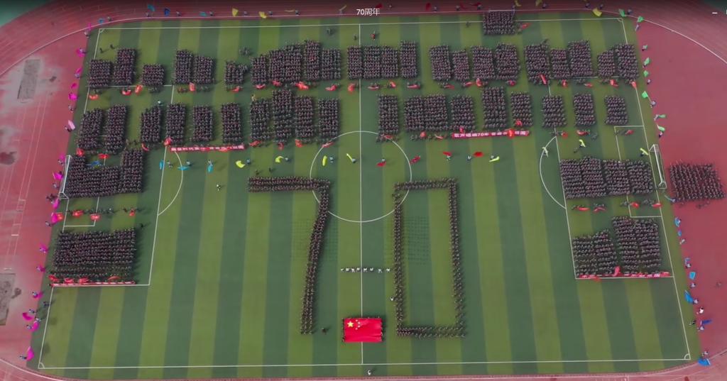 建功新时代,永远跟党走;以青春之我,勇担民族复兴使命。最后,全场师生挥舞着国旗,排着整齐的队列,汇成红色的海洋,齐声高唱《我和我的祖国》,用歌声表达心中的激动之情,并大声向祖国告白:“祖国,我爱你!祖国,我为你骄傲!”。青春的誓言在校园内久久回响,萦绕着青年人浓郁的爱国情怀,祝伟大祖国繁荣富强。