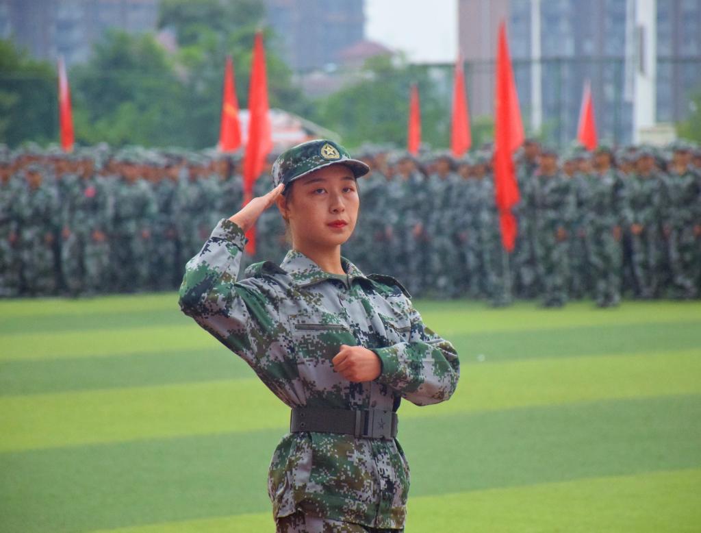 军训标兵代表赵胜同学发言。首先,他代表全体参训同学对辛勤指导的全体教官和细致入微关心的领导、老师表示感谢。其次,他说到同学们经过三个周的军训,锤炼了意志品质,养成了良好作风,培养了吃苦耐劳和团队协作精神,进一步增强了国防意识、纪律观念和爱国情怀。最后,他表示将延续军训精神,制定目标,努力学习,练就本领,尽早报效祖国。