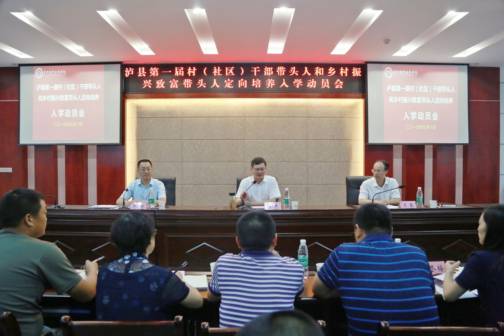 2019年9月10日下午,泸县第一届村(社区)干部带头人和乡村振兴致富带头人定向培养入学动员会在综合楼510会议室召开。学校党委书记何杰、泸县县委常委、组织部部长肖春,党建办副主任、组织一股主任付冬梅,泸天化学院相关人员、泸县籍52名学员参加会议,会议由泸天化学院党总支书记尹林主持。学员们合唱《打靶归来》拉开了此次动员会的序幕。