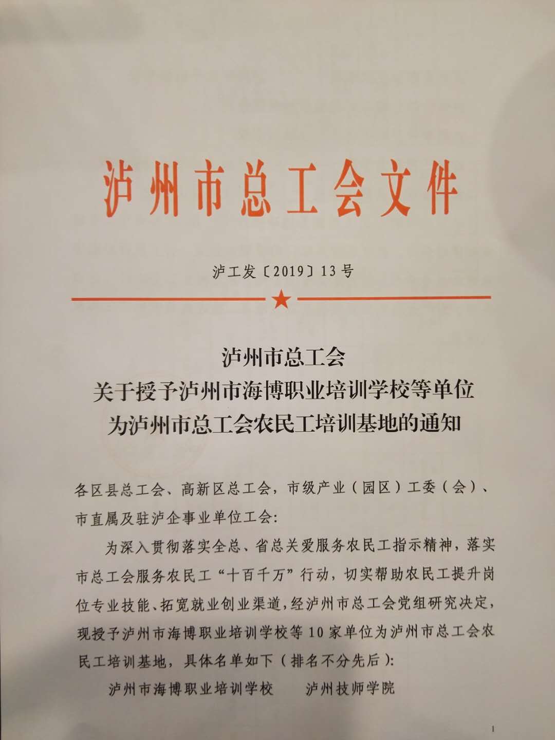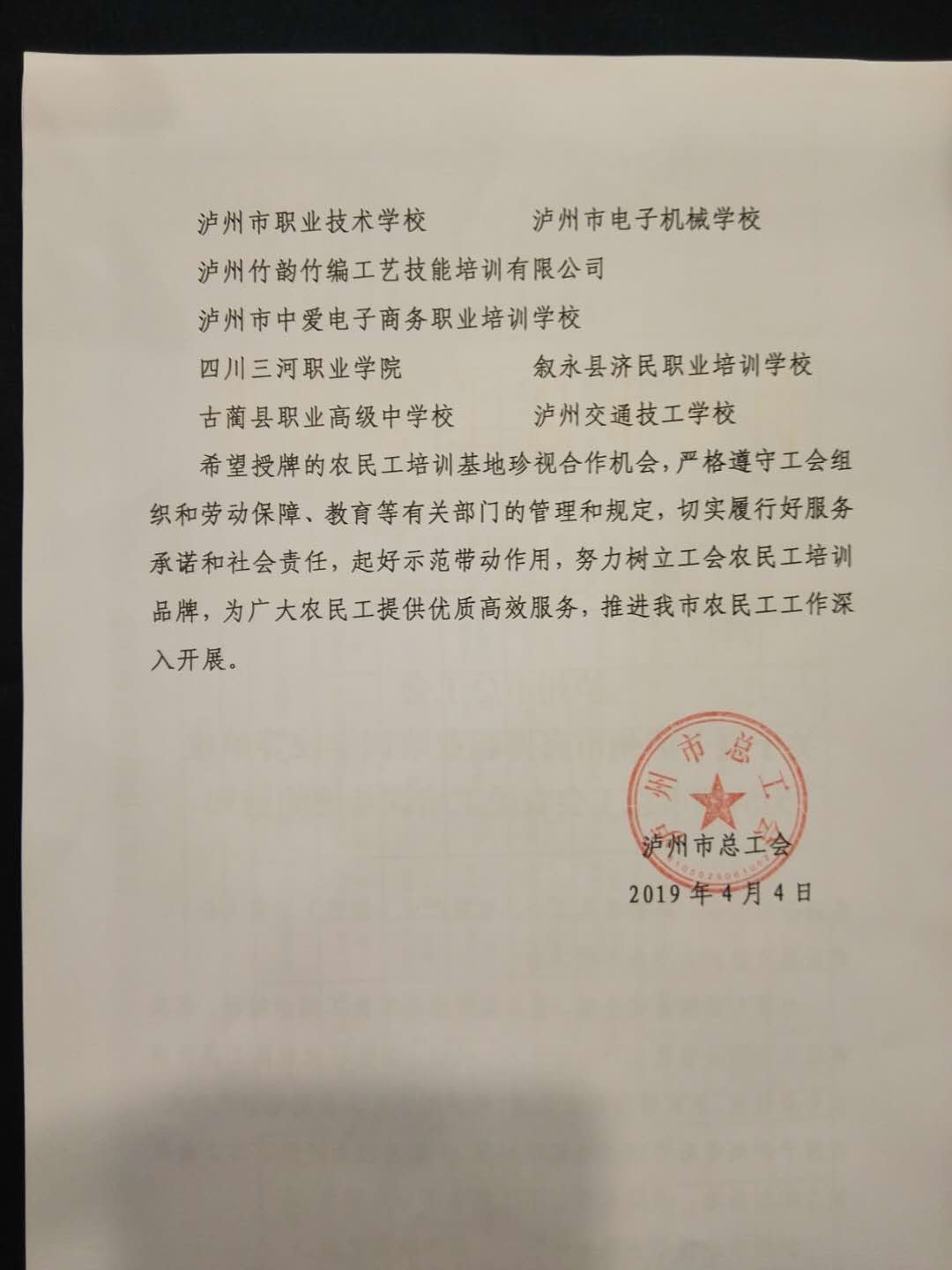 4月4日,泸州市总工会泸工发〔2019〕13号文件公布了泸州市总工会农民工培训基地名单并授牌,我院(泸州技师学院)名列其中。