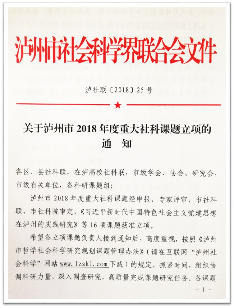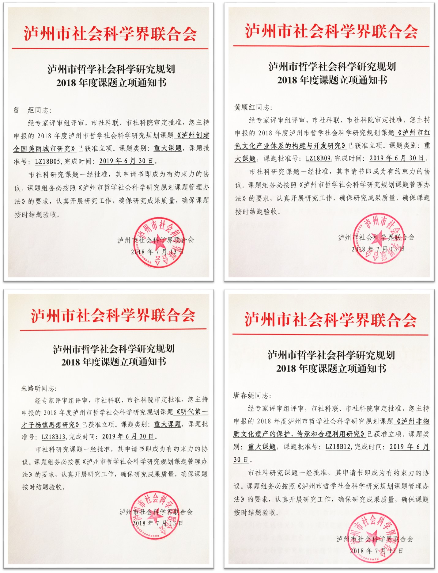 为做好全市2018年度重大社科课题研究工作,推出体现泸州特色和经验的系列研究成果,服务“决胜全面小康、建成区域中心”目标,2018年4月9日,泸州市社科联发布泸州市2018年度重大社科课题研究工作方案(征求意见稿)及泸州市2018年度重大社科课题选题指南,学院领导高度重视,学院社科联积极响应,由彭涛副院长任组长,召集专家,组建研究团队,讨论方案,在广泛收集资料的基础上,明确研究思路、制定工作方案,组织填写《泸州市重大社科课题申请书》,在时间紧、任务重的情况下,经过精心筹划,认真实施,各课题组于5月20日前顺利完成课题申报。2018年7月,泸州市社会科学界联合会发布了《关于泸州市2018年度重大社科课题立项的通知》,经泸州市社科界专家学者评审,泸州市社科联审定,共有16项课题获准立项,我院共有4个科研项目获得泸州市社科联重大社科课题立项,立项率跻身于泸州市各申报单位前列,可喜可贺。
