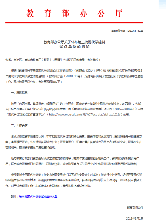 近日,教育部办公厅发布了《关于公布第三批现代学徒制试点单位的通知》(教职成厅函〔2018〕41号),我院成功入选教育部第三批现代学徒制试点单位,试点专业为酿酒技术专业。近年来,我院大力推行教育教学改革、深化产教融合、校企合作,积极探索现代学徒制人才培养模式,此次成功立项是学院推行现代学徒制试点工作的突出成效,也是开展优质校建设的又一项国家级标志性成果。