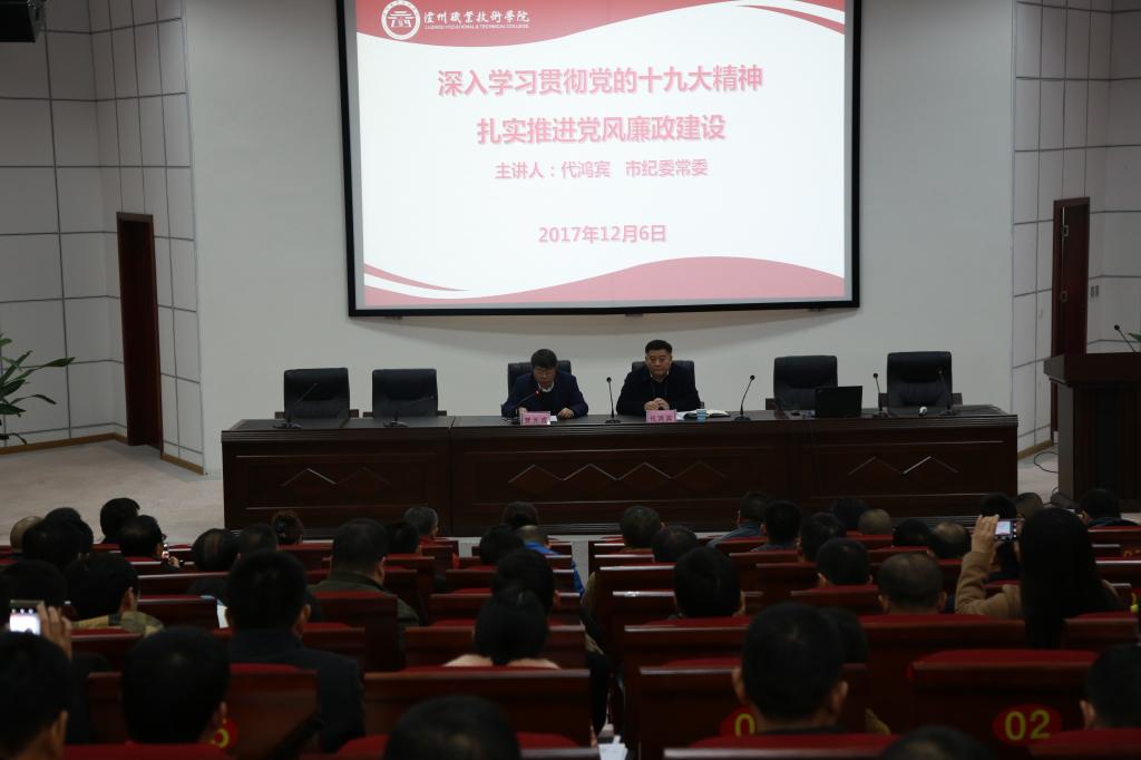 本站讯(信息来源:纪检监察处、宣传统战部)2017年12月6日下午,泸州市纪委常委代鸿宾在学院求实厅为学院党委中心组全体成员暨学院举办泸州市第16期中学校长任职资格培训班学员作党风廉政建设专题报告。代鸿宾常委强调,要深入学习贯彻党的十大九精神,落实全面从严治党要求,扎实推进党风廉政建设,切实构筑不想腐的堤坝,增强廉洁自律和拒腐防变的能力。学院院长贺元成主持报告会。