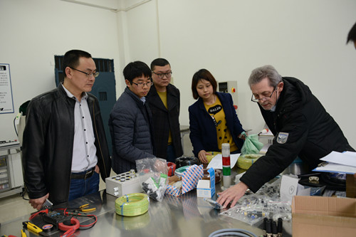 9日下午,德国专家首先参观了机械工程系中德班实训室,并观摩了两个专业的课堂教学。两位专家对中德班实训设备的准备工作及教学方式表示认可,同时也指出了在职业安全防范方面应该加强的地方。10-11日,两位专家检查了中德机电一体化师和切削师班的教学资料、教学记录,根据检查中存在的问题对两个专业所有教师开展了针对性的指导,指导内容主要有三个方面:首先,在课程安排方面,德方专家强调教学一定要遵循由易到难、由浅入深、理论与实践相结合的规律,教师要借助恰当的教学方法帮助同学们做好职前心理准备,并以两个专业的几门专业核心课程为例介绍了德国在这些方面的经验。其次,在教学注意事项方面,专家们着重强调了安全知识传授应先于专业知识传授,在任何专业课程学习中,都应把相关的安全准则、制度和急救措施等摆在首位,并与大家分享了德国职教在这方面的具体做法。最后,针对两个专业学生将要进行的HWK证书中期考试,专家详细介绍了考试的组织方式、题型及2015年的考试样题。14日,Ralf Dieter Suttner还带领机电一体化师的教师团队一起安装调试了机电一体化师中期考核用的电气控制柜,为将到来的中期考试做好设备准备工作。