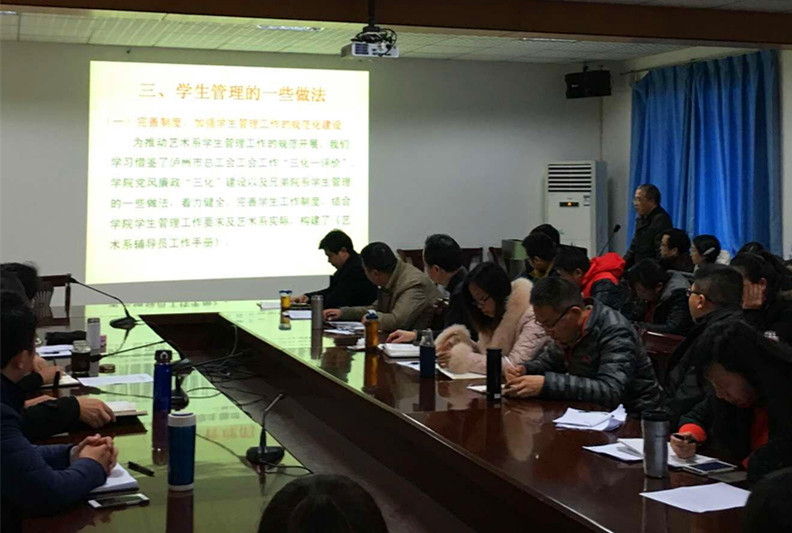 艺术系党支部书记唐必文以“完善制度建设,强化日常管理”为题,从艺术系学生及学生管理队伍的基本情况、艺术系学生管理的基本做法进行了讲解,着重介绍了艺术系在制度完善、学工队伍培训、服务与管理理念强化等方面的成功经验,并就艺术系在学生工作中的困难进行了交流。