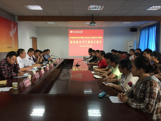本站讯(信息来源:招就处)2015年10月16日下午3:00,泸州职业技术学院、四川化工职业技术学院创新创业学生校际交流座谈会在我院六会议室召开。泸州市就业局创业指导中心主任周卫、舒琴,四川化工职业技术学院招生就业处处长罗伦忠,学生处副处长张波,南充市媚卡爱车美容服务有限公司总经理辛悦,泸州职业技术学院招生就业处处长洪兴华,团委副书记丁可以及两校创新创业学生代表出席此次会议,会议由学院招生就业处副处长刘昱聃主持。
