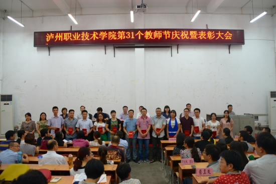 大会在庄严的国歌声中拉开帷幕。彭涛宣读了关于表彰2014-2015学年度学院优秀教师、教学十佳教师、优秀教育工作者、优秀辅导员的决定,并通报了我院商学院获得四川省教育工作先进集体称号。学院领导一一为受到表彰的同志颁奖。随后,徐波宣读了泸州市科技进步奖、泸州市社科优秀成果奖以及学院第九届学术月优秀论文的表彰决定,代华龙为获得泸州市科技进步奖的教师洪震颁奖。优秀教师代表胡丹萍同志围绕教师的职业性质,结合切身经历,作了生动而精彩的发言交流。
