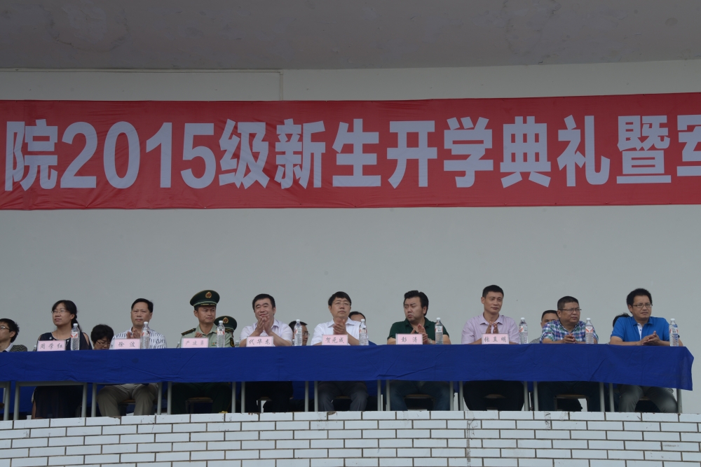 本站讯(信息来源:学生处)2015年8月31日上午9点,学院2015级新生开学典礼暨军训开营仪式在学院足球场隆重举行。武警泸州市支队参谋长严建勇中校,学院党委书记代华龙,院长贺元成教授,副院长彭涛、徐波、张直明、周学红莅临本次开学典礼暨军训开营仪式。仪式由学院党委副书记、纪委书记张爽主持。