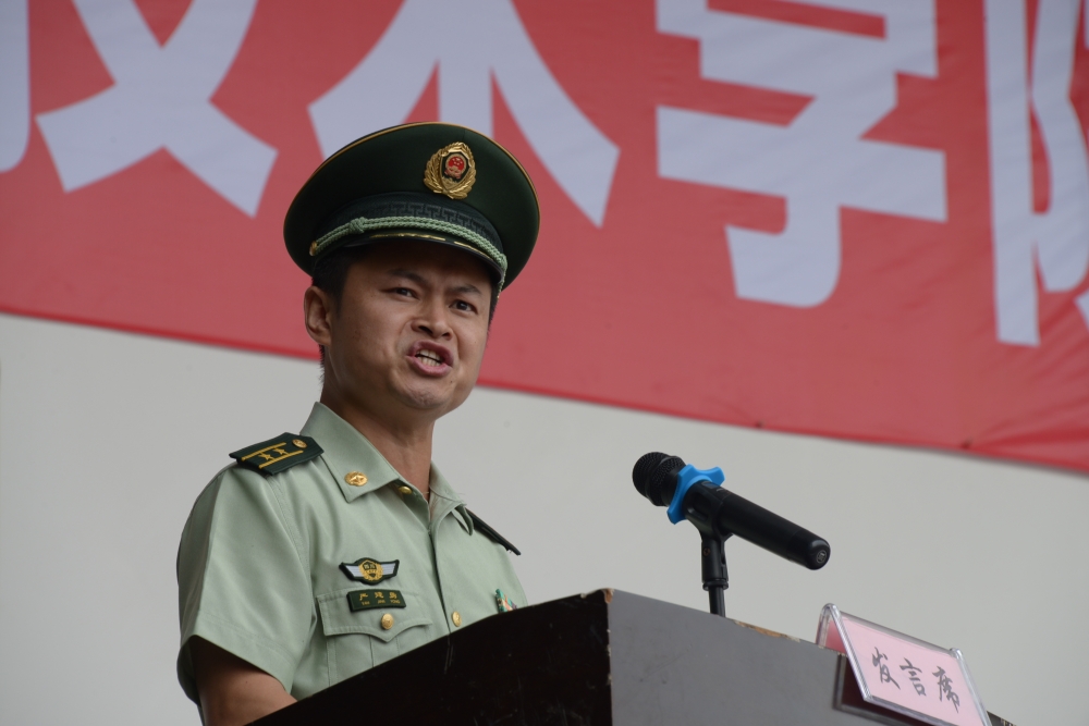 随后,武警泸州市支队参谋长严建勇中校讲话,他强调了军训对于大学生的重要性,军训不仅让同学了解我国国防军队的建设,了解军队的各种优良作风,更让同学们体验军人不怕苦、不怕累的坚毅品格。在军训中同学们要端正思想意识,增强安全意识,上好大学新生的第一堂必修课。