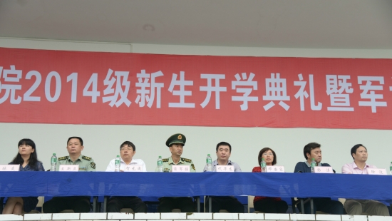 2014级新生军训开营仪式在庄严的升旗仪式中拉开帷幕。学院院长贺元成教授代表学院党政向出席仪式的武警泸州市支队领导、市作训办领导和承训部队全体教官表示热烈的欢迎和诚挚的感谢!向2014级新同学表示最热烈的欢迎!贺院长对学院的办学理念、办学思路、发展战略以及近几年来的快速发展作了相应的介绍,贺院长还提到学院顺利通过了四川省省级示范性高职院校建设验收,成功创建泸州技师学院并挂牌,被认定为四川省高技能人才培训基地。学院新校区正如火如荼地全面建设,明年新校区将投入使用。贺院长以“自强不息,勤奋敬业”的校训精神鼓舞新生,希望他们在军训中锻炼毅力、磨练意志,以饱满的热情,全身心的投入到大学生活的第一课,并将军训中学到的吃苦耐劳,勤奋锻炼的精神贯彻到今后的大学生活中