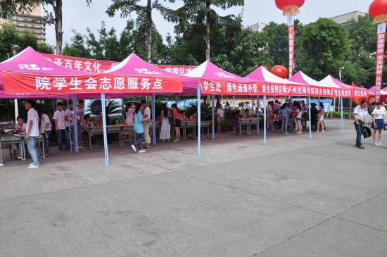 29日清晨7点,学院内外各迎新服务点早已准备就绪。此次迎新学院设有校内、校外两部分服务点。校外服务点设置在广场车站与西南商贸城,校外服务点的设置为新生顺利到达学校提供了有力的保障;同时,校内服务点的设置高效而合理,主要集中在学院正门广场,各服务点紧密配合,为初到学院的新生与家长们提供了方便,减少了办理入学手续所需消耗的时间。