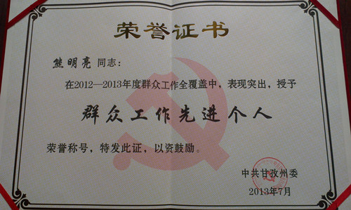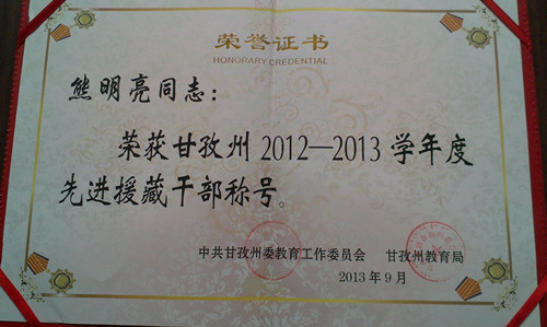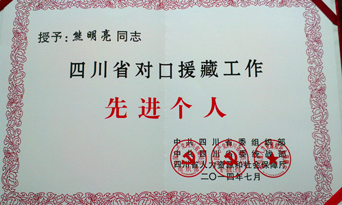 我院援藏干部熊明亮同志在挂任甘孜藏族自治州乡城县教育局副局长两年来,努力克服高原缺氧恶劣气候和崎岖危险的盘山路带来的不利影响,积极投身到援藏工作中,深入高海拔山区一线调研和宣传党的富民政策,撰写调研报告,带领乡城教师积极申报课题,为乡城教育出谋划策并积极落实各项教育培训项目,倾情开展群众工作,对口扶持贫困学生,为山区学校对口扶持牵线搭桥,充分体现了“艰苦不怕吃苦,缺氧不缺精神”的援藏精神,谱写了“脚踏实地雪域履使命,用心用情汉藏一家亲”新篇章,为藏区教育做出了积极贡献。由于熊明亮同志援藏工作表现突出,继去年先后被甘孜州委和甘孜州教育局表彰为“群众工作先进个人”和“优秀援藏干部”后,在这次全省第二批援藏工作总结会上,四川省委组织部、四川省委统战部、四川省人社厅等部门联合授予熊明亮同志“四川省对口援藏工作先进个人”。至此,泸州市第二批援藏工作圆满结束,我院援藏干部也圆满完成了援藏任务。