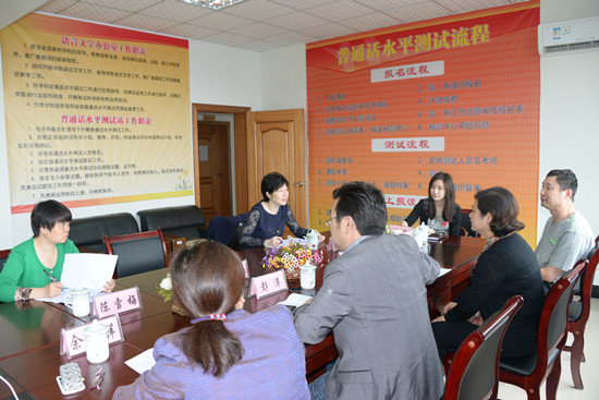 座谈会上,彭涛以及潘绿萍、余晓萍和学院语言文字研究所所长银进康分别就学院基本情况、在校学生规模、普通话水平测试工作的制度建设、学生普通话测试培训、普通话课程建设、测试员队伍建设、测试员对外社会服务、计算机辅助测试的筹备等方面向检查组做了汇报。
