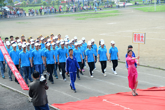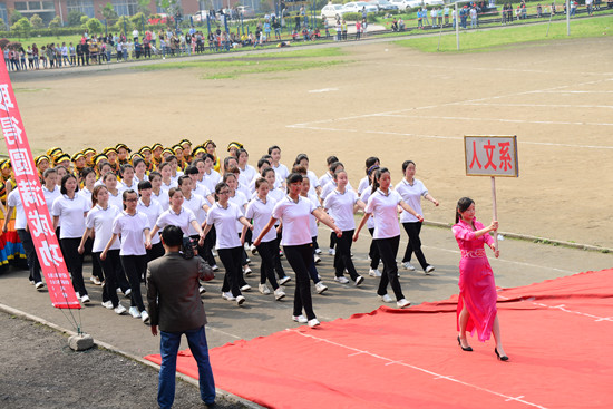 下午3点,开幕式准时开始。学院国旗队、院旗队、会旗队、鲜花队、彩旗队、裁判队、教工队、学生志愿者方队和各系部(院)、青师大泸州校区运动员代表队等17个方队迈着矫健的步伐,喊着响亮的口号,跳着各具特色的民族舞蹈依次走过主席台,接受全院师生的检阅。本届“玉章”体育文化节开幕式以展现民族团结为主题,各系(院)方队分别代表不同民族,用该民族特有的服饰和舞蹈展现其特色,如黎族、高山族、维吾尔族、苗族、彝族、朝鲜族、藏族等,最后在《爱我中华》的歌声中大家欢快起舞。