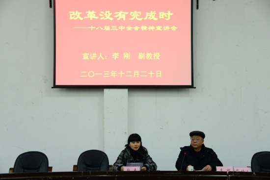 李刚副教授结合他本人多年从事思政教育工作的经验,从改革能力决定大国的兴衰、深化改革必须要扫除思想障碍、今后五至十年改革的重点和难点等三个方面对党的十八届三中全会精神进行了深入解读;深刻地分析了改革对政治、经济、文化、社会等方面的影响;重点强调了党的十八届三中全会深化改革的主题。宣讲会分析全面深刻、举例形象生动,引起在场听众的强烈反响。