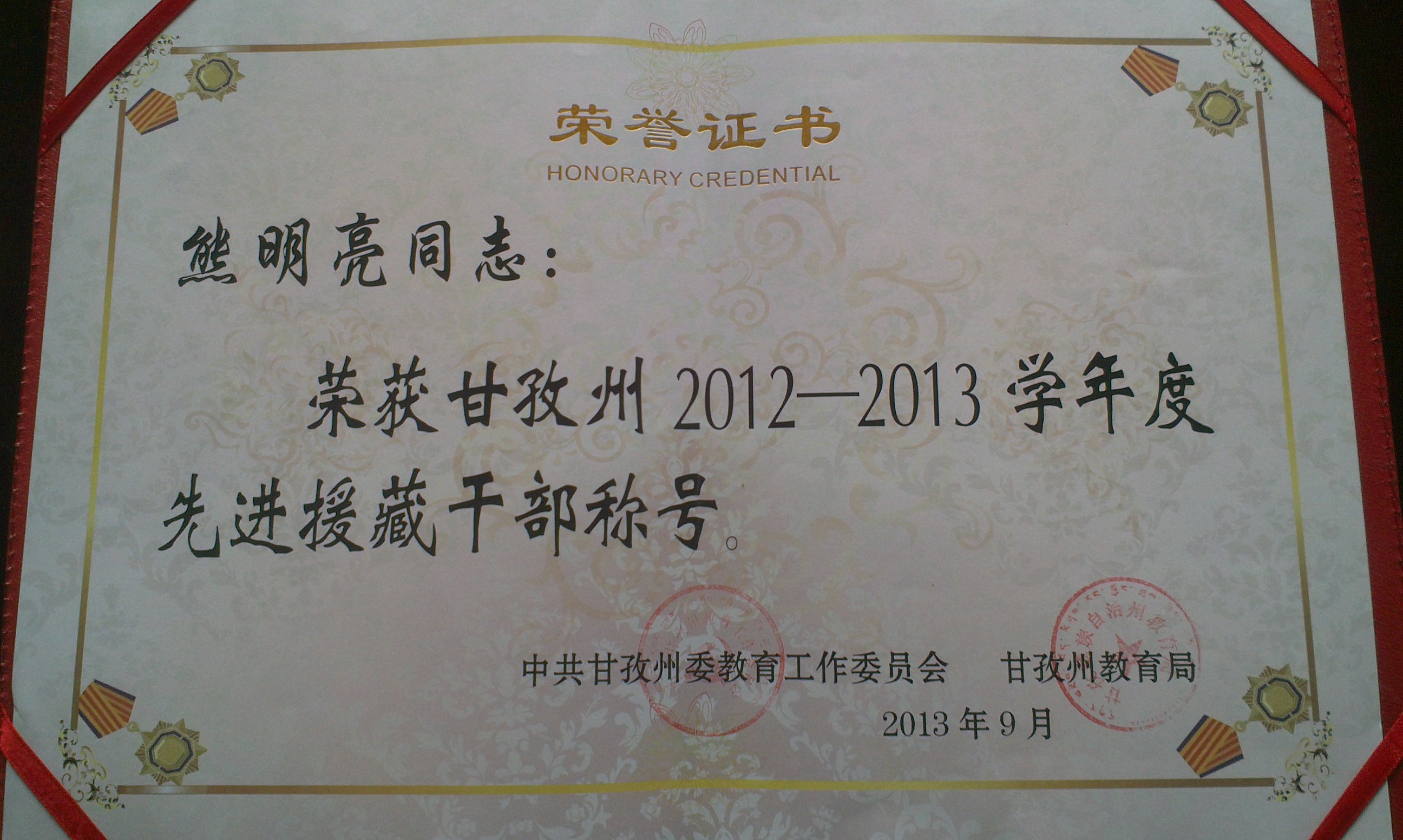 自2012年7月以来,学院援藏干部熊明亮同志在挂职甘孜州乡城县教育局副局长期间,积极投身到援藏工作中,为乡城教育出谋划策,并积极落实各项教育培训项目,谱写了“脚踏实地雪域履使命,用心用情汉藏一家亲”新篇章,为藏区教育做出了积极的贡献。由于援藏教育工作表现突出,在2013年教师节表彰大会上,中共甘孜州教育工作委员会、甘孜州教育局授予熊明亮同志“甘孜州2012-2013学年度先进援藏干部”称号。