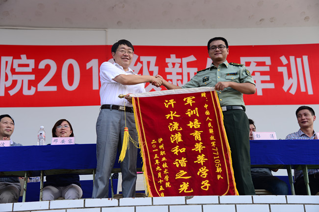 贺元成院长为承训部队颁发了锦旗。彭涛副院长宣读了《关于表彰2013级新生军训工作先进集体和优秀个人的决定》,承训部队和学院领导为获奖集体和个人颁发了奖状和证书。