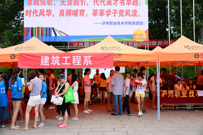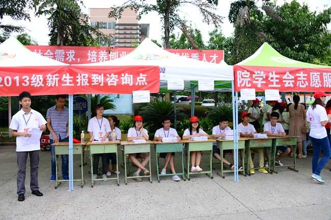 此次新生报到主接待场设在学院正门的升旗台广场。学院招生就业处、教务处、学生处、计财处、后勤服务中心、团委、卫生所等相关职能部门和八个教学系院均设有服务点。服务点的老师和大二、大三学生志愿者们不断忙碌着为新生办理各种入学手续。学生处团委还专门组织学生干部志愿者协助各系院和各职能部门现场报到和到车站迎接新生,竭诚为新生服务。