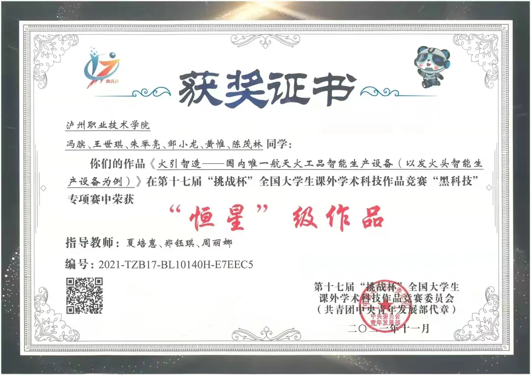 ▲《火引智造——国内唯一航天火工品智能生产设备(以发火头智能生产设备为例)》获第七届国际互联网+大学生创新创业大赛省赛金奖、国赛铜奖,并在第十七届“挑战杯”全国大学生课外学术科技作品竞赛“黑科技”专项赛中获“恒星”级作品