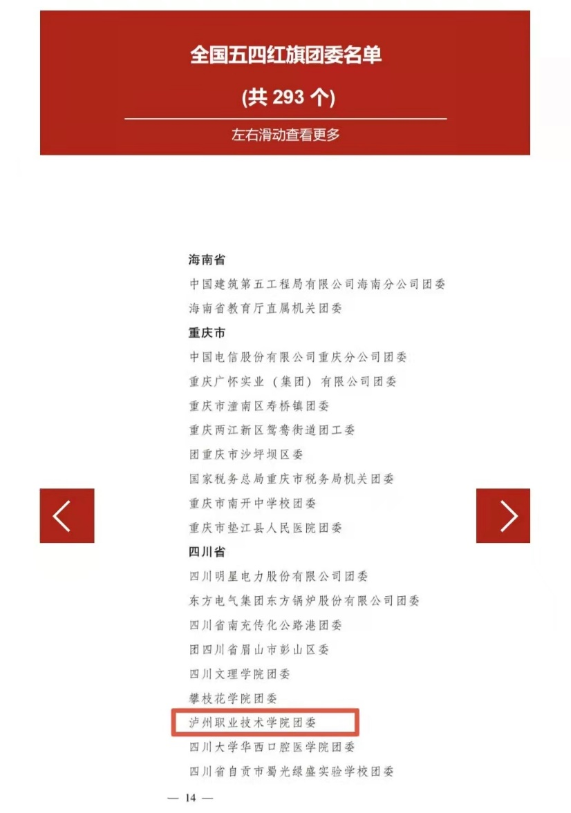 4月13日,共青团中央作出表彰决定,授予293个团组织“全国五四红旗团委”称号,共青团泸州职业技术学院委员会被授予“全国五四红旗团委”称号。我校是四川省唯一获得该称号的高职院校。
