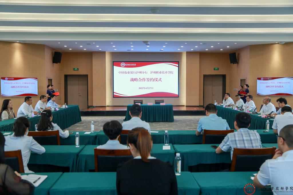 仪式上,学校副院长卢世伦和中国农业银行泸州分行副行长张宇辉签署了银校战略合作协议。根据协议,双方将在校区建设、信息化建设、金融结算、产教融合、学生优质就业帮扶等领域开展深度合作。
