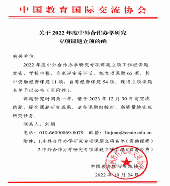 “中外合作办学研究专项课题”是为了贯彻落实《教育部等八部门关于加快和扩大新时代教育对外开放的意见》,聚焦“一带一路”沿线国家教育共同体建设,坚持问题导向,结合已有研究基础和工作实际,推动我国中外合作办学科学发展,具有十分重要的理论及现实意义。