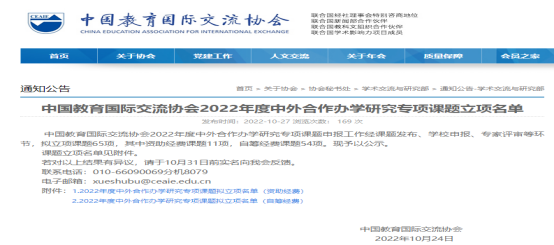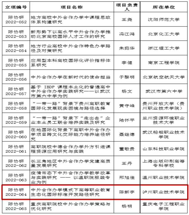 近日,中国教育国际交流协会公布了“2022年度中外合作办学研究专项课题”立项名单,我校国际教育学院副院长陈新宇教授申报的《中外合作办学模式下高等职业教育生态化国际标准开发路径研究》(项目编号:际协研2022-064)获批立项。