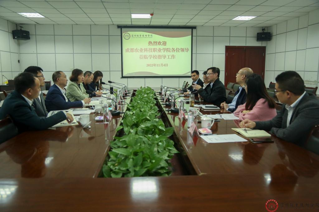 11月4日,成都农业科技职业学院院长严吉明,副院长王慧、李维彬赴我校调研交流,学校党委书记何杰,党委副书记、院长谢鸿全,党委常委、副院长熊剑陪同调研。