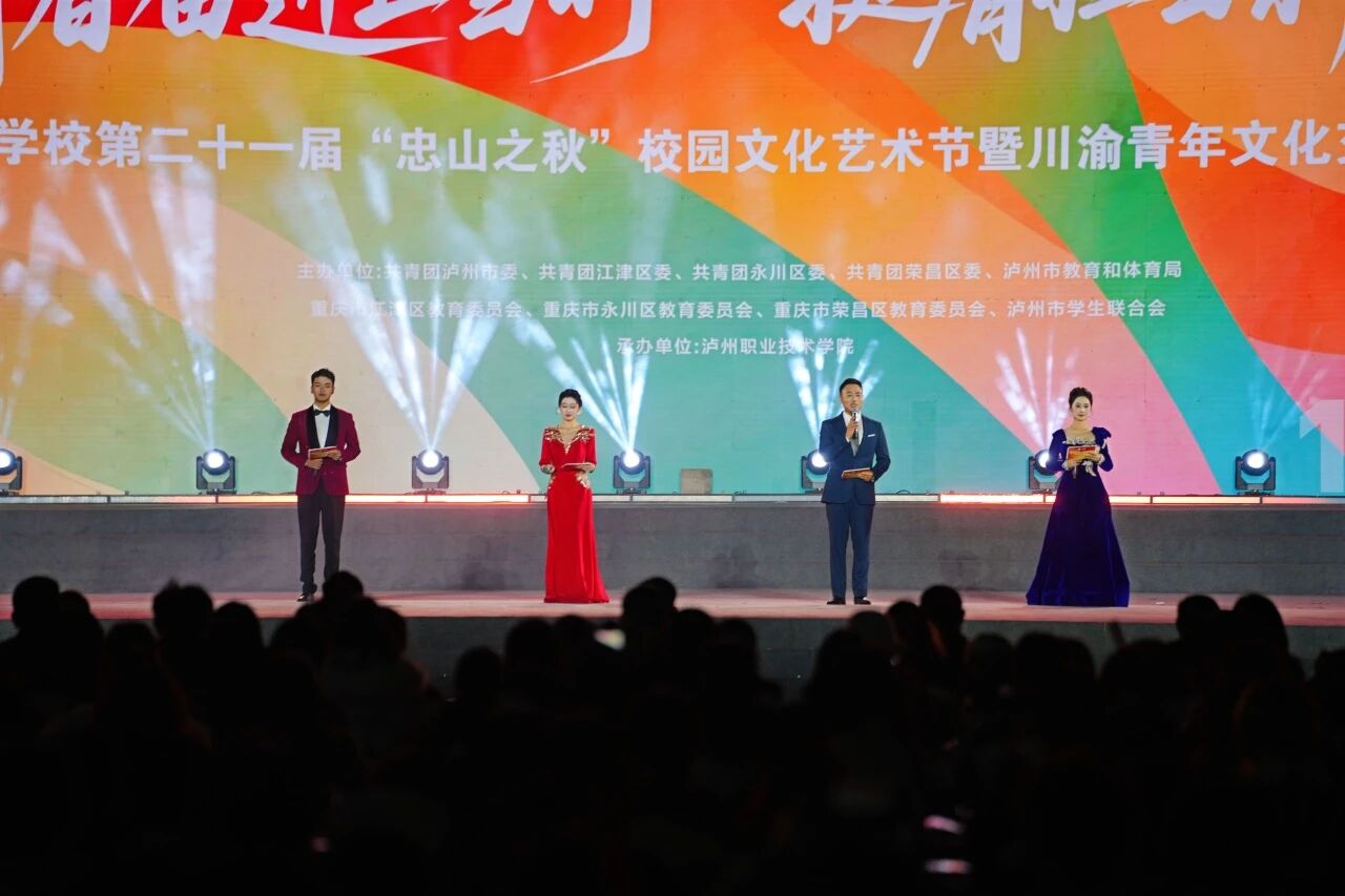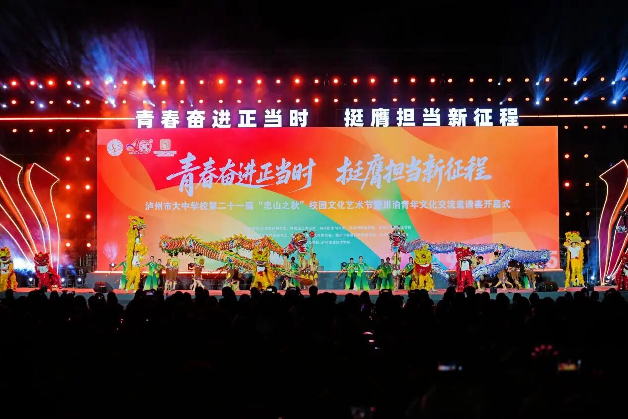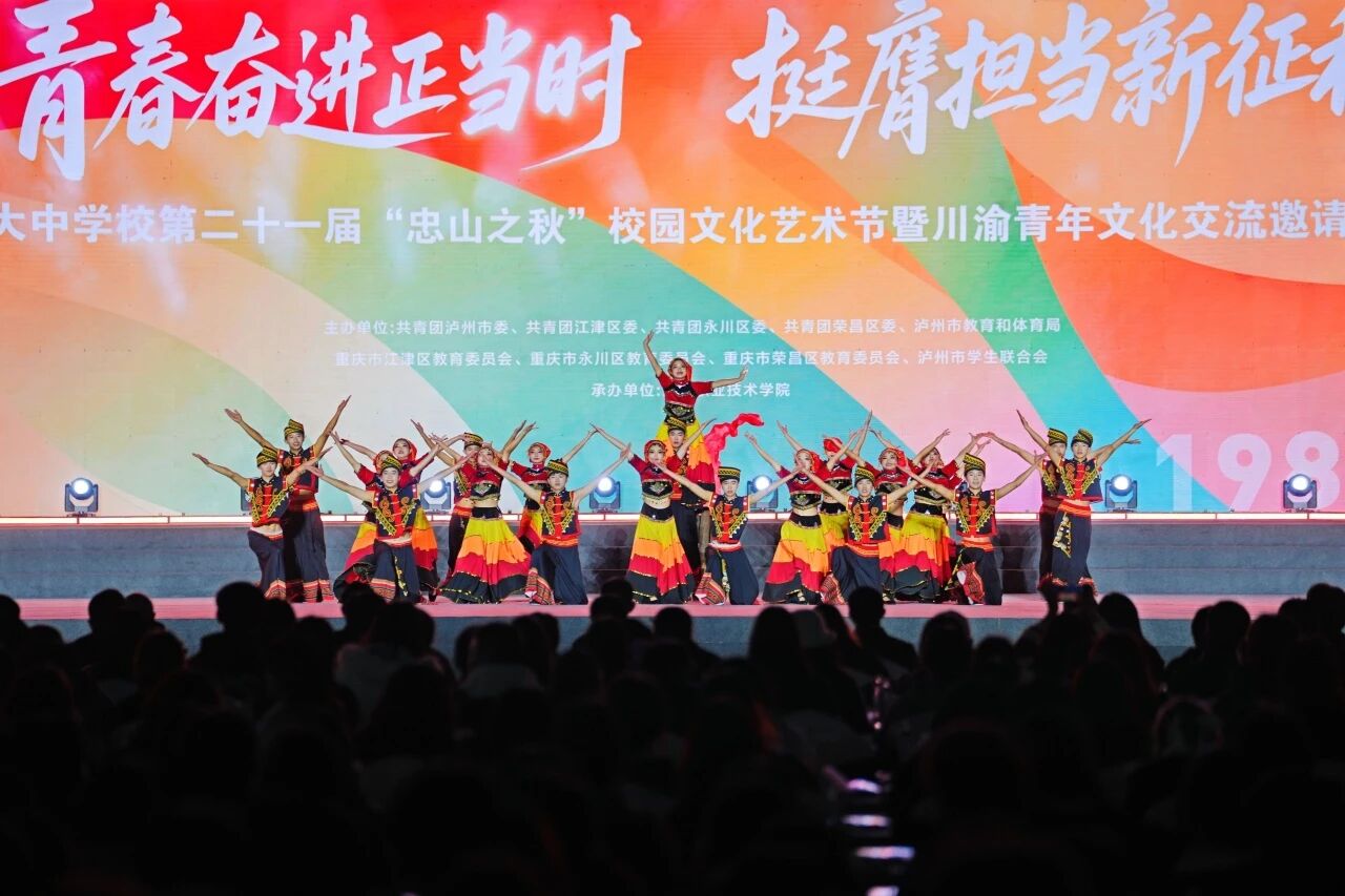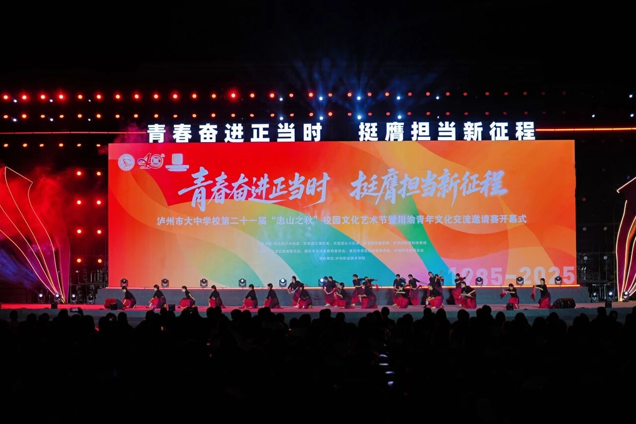 今年,泸州市大中学校第二十一届“忠山之秋”校园文化艺术节暨川渝青年文化交流邀请赛在泸州职业技术学院开幕,以14项涵盖语言、体育、艺术、社团风采的多元赛事为核心载体,更以兼具红色底蕴与青春活力的开幕式演出为点睛之笔,既延续了“忠山之秋”薪火相传的精神内核,更串联起川渝青年的才情与担当,呈现出一场集竞技风采、艺术魅力与青春热情于一体的高品质校园文化盛会。