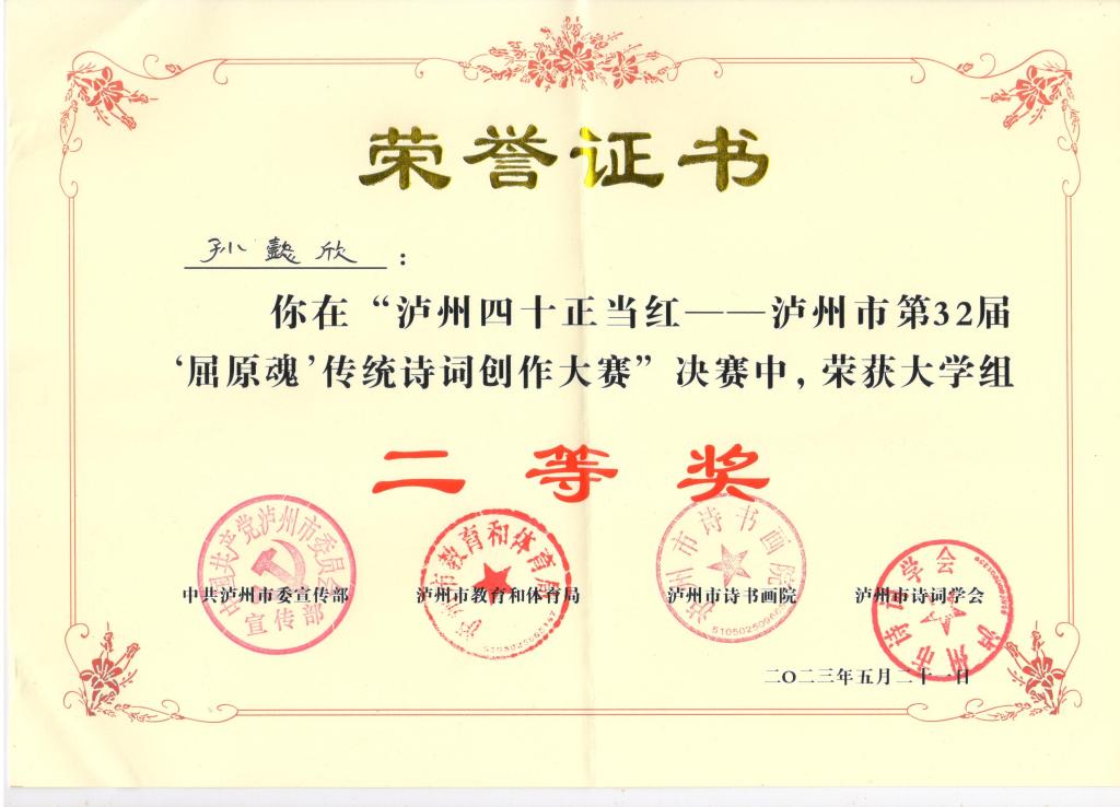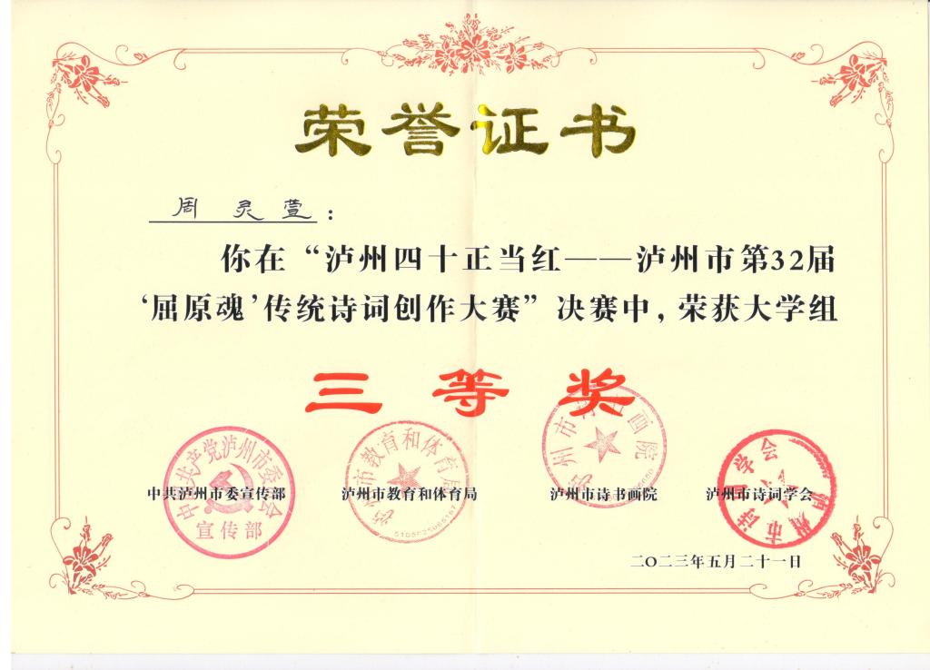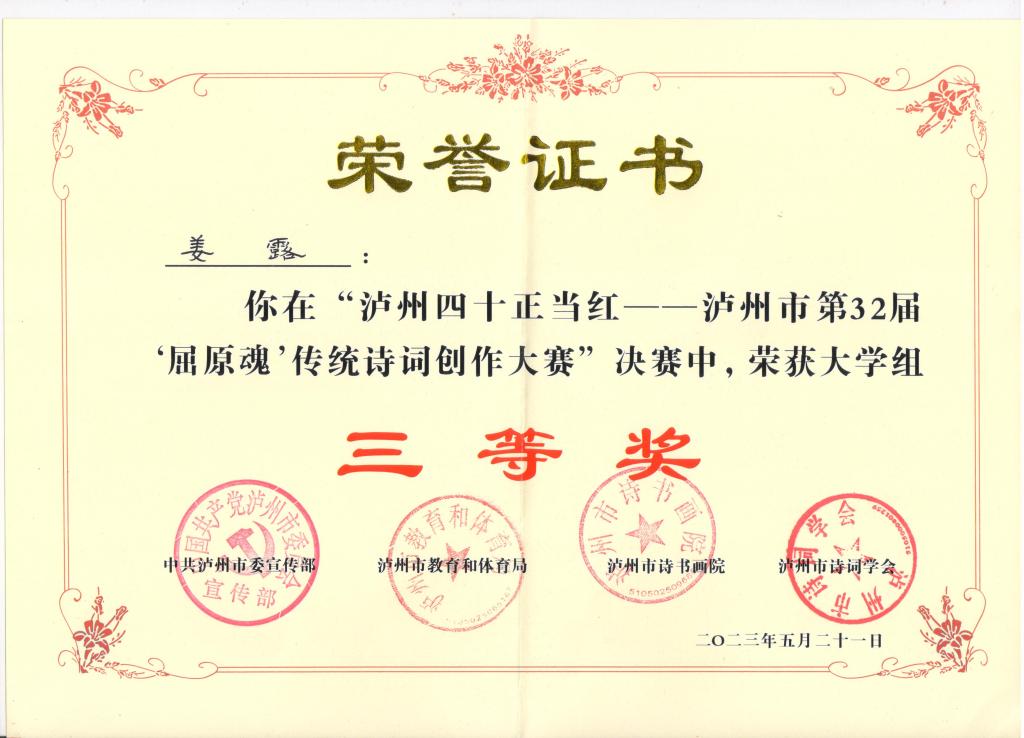 5月21日,主题为“泸州四十正当红”的泸州市第32届“屈原魂”传统诗词创作大赛决赛在泸州一中举行。我校学子孙懿欣在决赛中荣获大学组二等奖,姜露、周灵萱两位学生荣获大学组三等奖。决赛大学组总共仅设6个获奖名额,其中一等奖一名、二等奖两名、三等奖三名,我校学子囊括决赛大学组一半奖项。