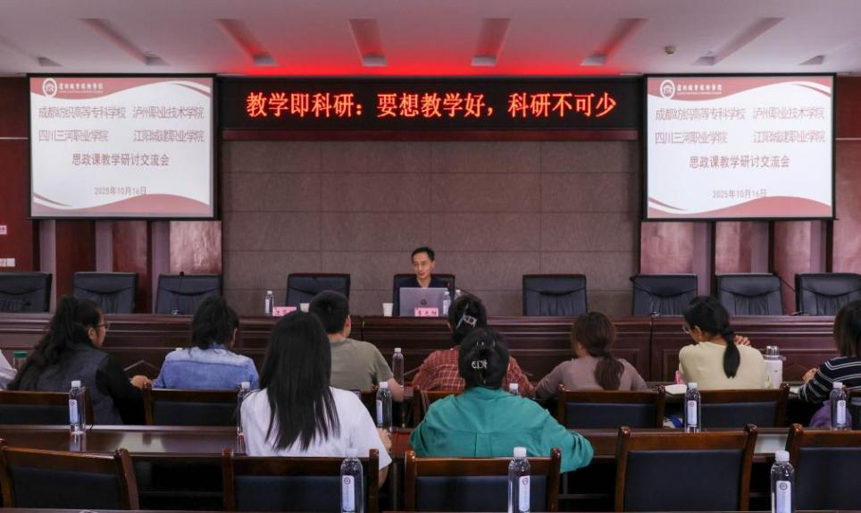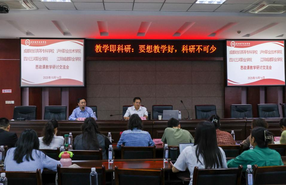 10月16日,应我校邀请,成都纺织高等专科学校、四川三河职业技术学院、江阳城建职业技术学院三校马克思主义学院教师代表到校,共同开展思政课教学科研提升研讨活动。学校党委副书记熊剑、副院长鲍学东到会指导,成都纺织高等专科学校马克思主义学院院长李光胜教授作主题讲座。