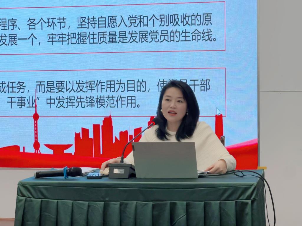 本次培训由学校组织人事处副处长王春燕同志担任主讲,培训内容系统全面、重点突出,紧密围绕发展党员工作的五大阶段、二十五个环节层层展开,深入阐释了发展党员工作的政治要求、标准条件和程序规范。王春燕同志结合学校党员发展工作实际,对“申请入党”“积极分子确定与培养教育”“发展对象的确定与考察”“预备党员的接收”“预备党员的教育、考察和转正”等关键节点的具体要求、常见问题、注意事项以及必须严格禁止的事项进行了条分缕析的解读。整个讲解过程逻辑清晰、案例详实、语言生动,既有对政策理论的深度解读,也有对实际操作中难点、堵点的精准指导,为全体参训人员提供了一份清晰实用的“工作指南”和“操作手册”。
