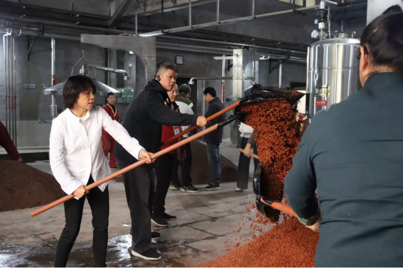 学员们还依次走进浓香型、清香型与酱香型白酒酿造车间,开展深度研学。在酱香酒车间,学员们不再只是旁观者,而是在师傅的指导下亲手参与摊晾、拌料、上甑等关键工序。这种“零距离”的实操体验,让大家深刻感受到酱香酒酿造工艺的复杂与精确,也将书本知识转化为真实的工艺体悟。