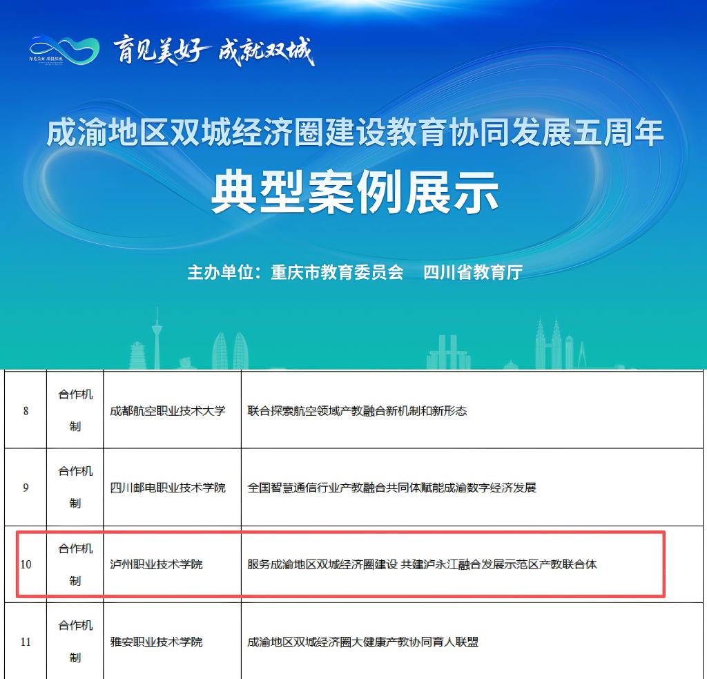 为全面推动成渝地区双城经济圈建设教育协同发展五年实施成效,充分发挥典型案例的示范引领作用,推动区域教育高质量发展,近日,重庆市教育委员会、四川省教育厅联合发布推动成渝地区双城经济圈建设教育协同发展五周年典型案例,学校《服务成渝地区双城经济圈建设共建泸永江融合发展示范区产教联合体》案例成功入选。