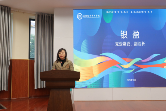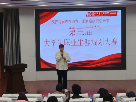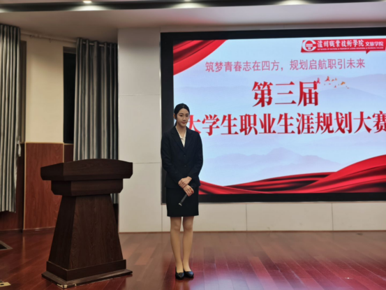 银盈在致辞中指出,职业规划是大学生成长成才的“导航图”与“指南针”。学校始终坚守“以生为本”育人理念,将职业规划教育贯穿人才培养全过程,本次大赛既是深化“三全育人”改革的重要载体,更是推动就业指导提质增效、助力学生高质量就业的关键举措。她鼓励全体参赛选手以赛为媒,在思想碰撞中明晰职业方向,在实战比拼中锤炼核心能力;希望同学们立足专业所长、紧扣时代脉搏,将个人理想融入行业发展与国家需求,用科学规划铺就成长之路。银盈强调,学校将持续搭建优质成长平台,全方位助力同学们实现从“校园人”到“职场人”的平稳转型。