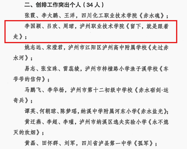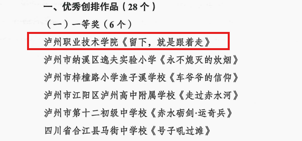 我校获奖作品《留下,就是跟着走》紧扣四渡赤水红色主题,依托泸州本土红色文化资源,由师生共同创排演出,以艺术形式生动再现革命历史,深情讲述红军长征途中感人至深的故事。作品在思想性、艺术性、教育性上实现有机统一,充分展现了我校师生传承红色基因、赓续红色血脉的使命担当,也体现了我校在思政育人模式上的创新探索。