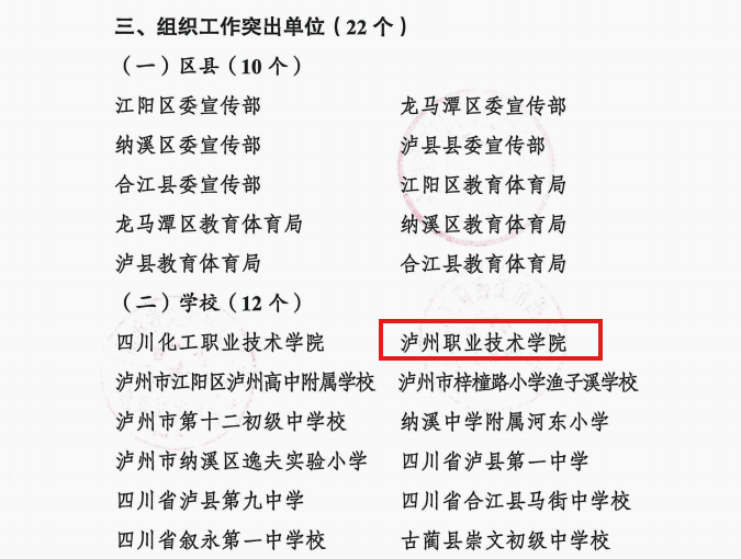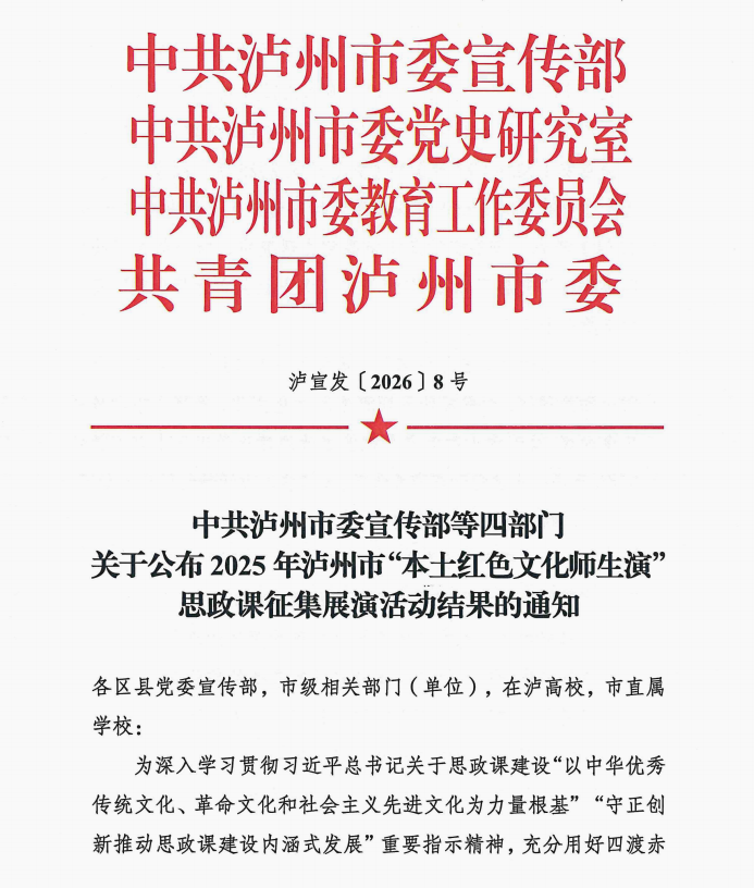 近日,中共泸州市委宣传部等四部门联合发布《关于公布2025年泸州市“本土红色文化师生演”思政课征集展演活动结果的通知》,泸州职业技术学院选送的原创思政作品《留下,就是跟着走》从众多参评作品中脱颖而出,荣获一等奖。同时,我校教师李国颖、吕欢、周珺获评“创排工作突出个人”,学校荣获“组织工作突出单位”称号。