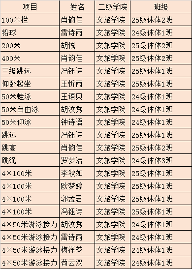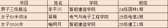 校园男子组中,李平川斩获110米栏、三级跳远冠军并破纪录,里来古散包揽400米、800米、1500米三项冠军,李里小军、黎宏波、王旭等在游泳项目中摘金。校园女子组里,蒋萌50米仰泳、喻明月3000米均破纪录夺冠,王春梅、袁杰、魏丽等运动员表现亮眼。专业组文旅学院运动员肖韵佳、雷诗雨分别打破纪录,尽显专业竞技水平。