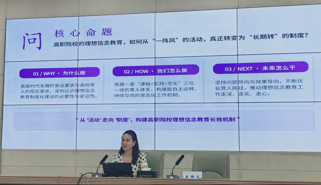 在大会交流环节,李国颖副院长以《新时代高职院校学生理想信念教育常态化制度化的现实困境与优化路径》为题作专题学术交流。她立足高职院校立德树人根本任务,结合学校实践探索,系统阐释了新时代推进理想信念教育常态化制度化的时代价值、现实困境与实施路径,充分展现了我校在思政理论研究与育人实践中的思考与成效,得到与会专家学者的充分肯定与积极回应。