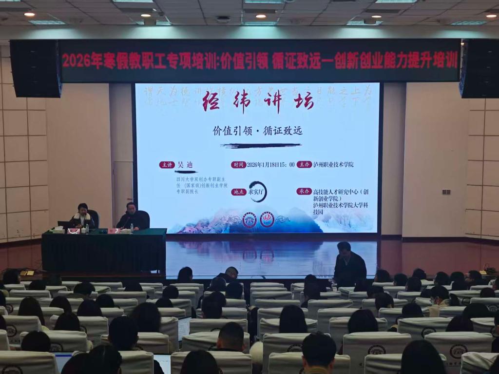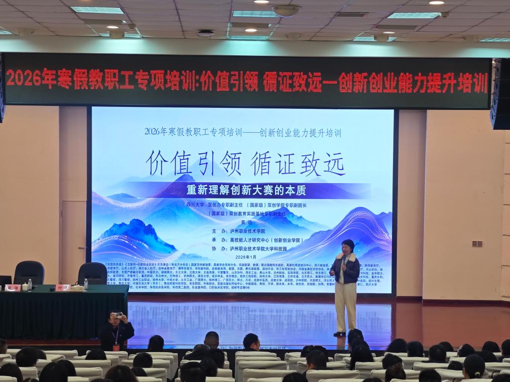 为进一步加强我校创新创业教育工作,提升教师双创指导能力与项目培育水平,2026年1月18日下午,由高技能人才研究中心(创新创业学院)组织的“2026年寒假教职工专项培训——创新创业能力提升培训”在求实厅顺利举行。本次培训特邀四川大学创新创业工作领导小组办公室专职副主任吴迪担任主讲。各职能部门负责人、二级学院主要领导和分管双创工作领导、双创教研室教师、高层次人才、专兼职辅导员等共200余人参加了培训。学校党委常委、副院长付波主持活动。