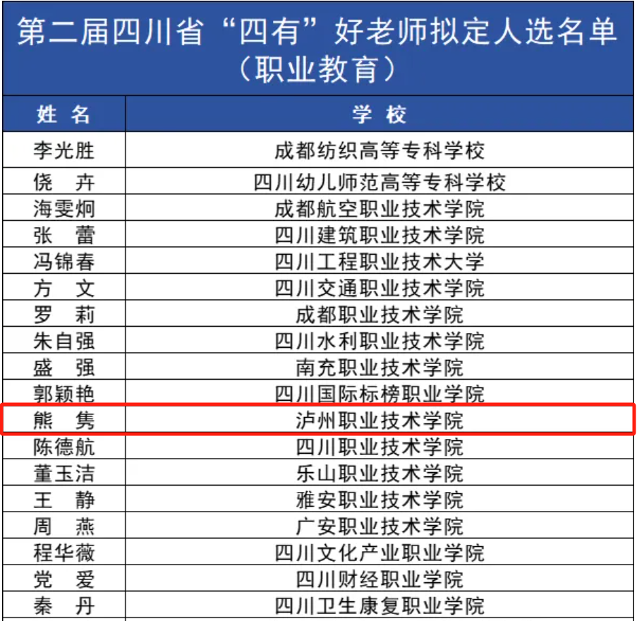 2024年8月7日,四川省教育厅公示第二届“四有”好老师拟定人选,我校熊隽教授榜上有名。