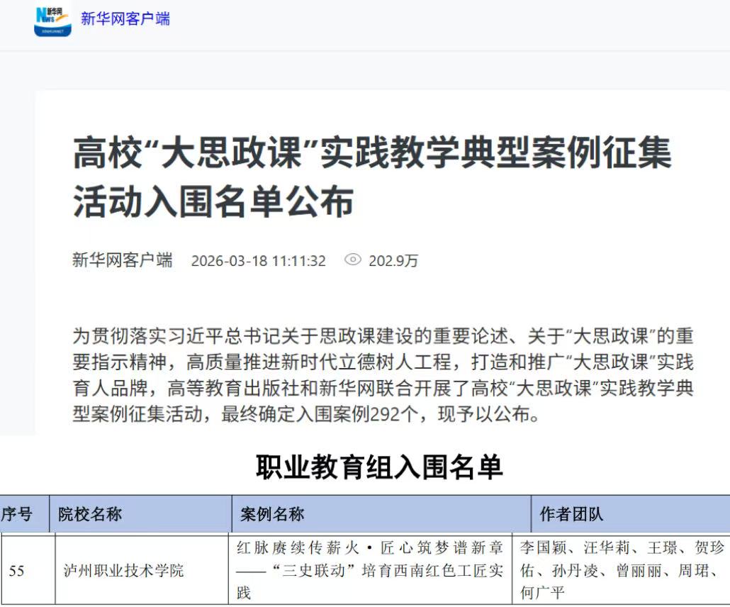 此次入选是对我校持续深化“大思政课”建设、推动思政课改革创新的充分肯定。学校将以此为契机,进一步发挥典型案例的示范引领作用,持续推进思政课实践教学内涵式发展,加快构建“大思政课”育人新格局,为培养担当民族复兴大任的时代新人贡献泸职力量。